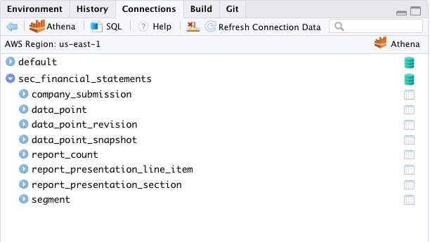 Lastly, the code to set up the connection object with our AWS Access Key ID and AWS Secret Access Key is shown below. We have used the keyring package to hide our credentials as our code will be posted on Github, but any other method is also fine. The driver is straightforward as RAthena::athena(). At first, we were unsure what to set for the schema and used “default”, as that was one of the options in our Athena Query Editor page, but we later learned that the correct choice was “sec_financial_statements”. When this is used, the database and all the tables can be navigated from RStudio’s “Connections” pane as shown below (almost as if they were regular data.frames in the global environment). This is not exactly the case because the data hasn’t been “materialized”, but it is helpful in visualizing the fields in each table and traversing the database.