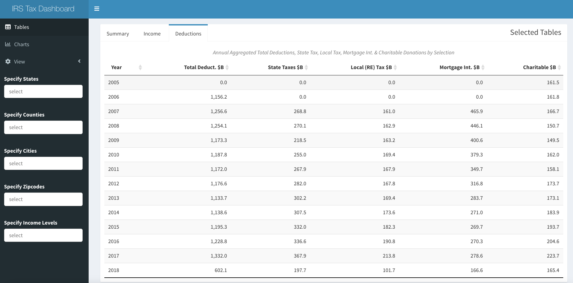 By choosing the "Deductions tab, Total, State Taxes, Local Tax, Mortgage and Charitable Deductions in aggregate over time is displayed.
