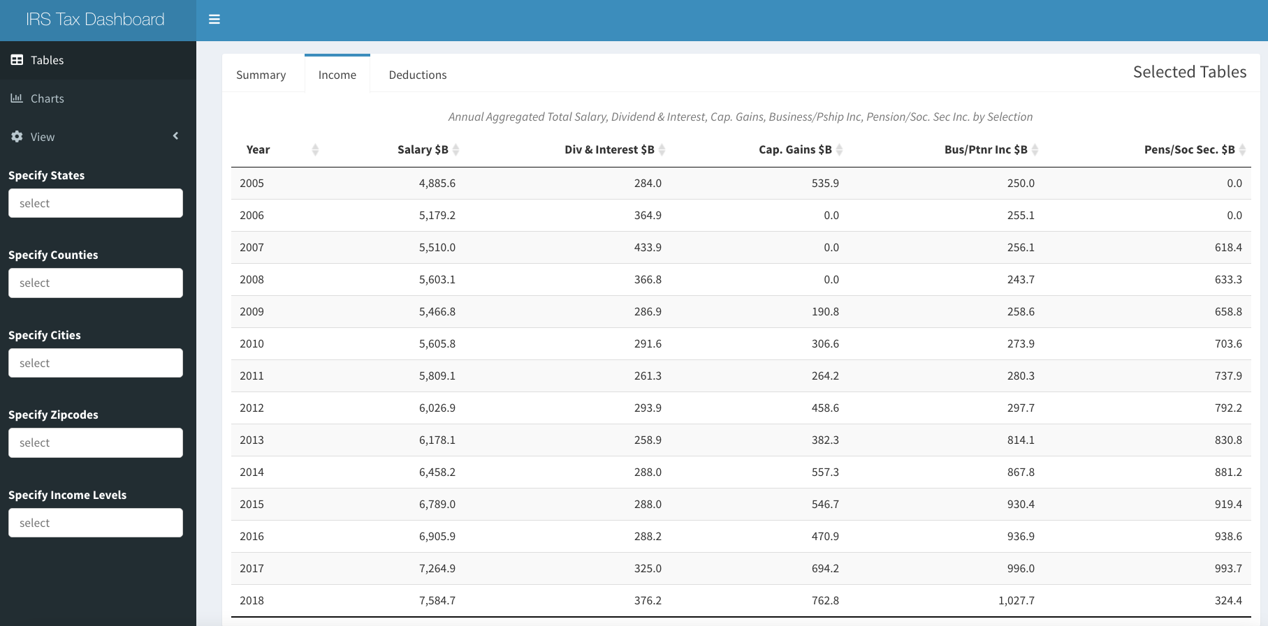 We were going to include the app in this blog post, but it is large and may take a little time to load, so please read the post and then follow the links to explore. When the app launches, it displays the aggregate AGI, tax paid, returns and unique zips for all of the data, included on the “Summary” table tab as shown at the beginning of the post. Choosing the “Income” tab, key component income sources, such as Salary, Dividends & Interest, Capital Gains, Business and Partnership Income and Pension & Social Security Income are displayed, can be explored over time.
