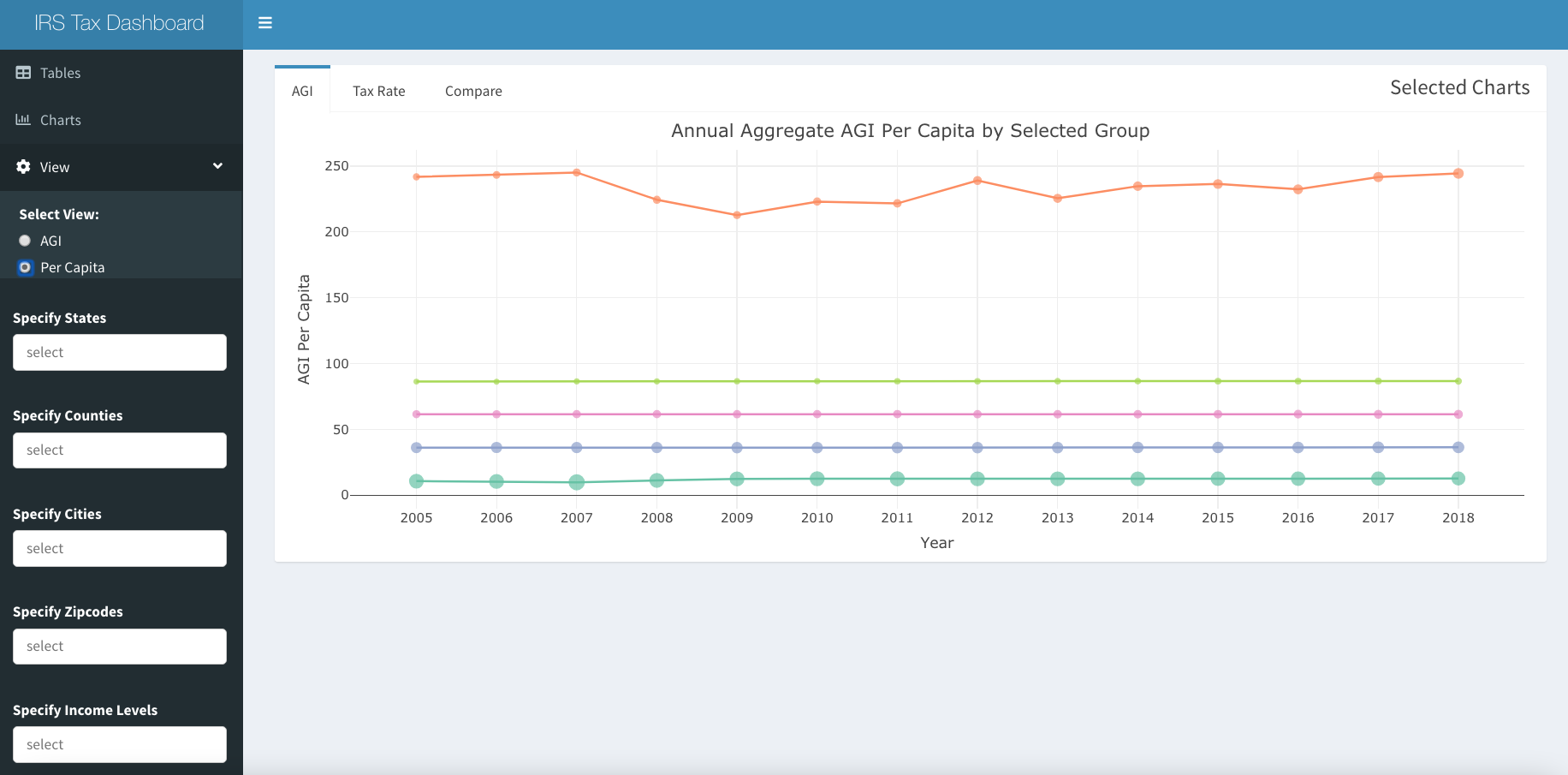 Using the three horizontal line icon at the top left, it is possible to access other tabs and filters. There is a second tab called “Charts” to see a plots of the change in AGI and tax rates over time. It is possible to see Aggregate or Per Capita by selecting with the “View” switch. The second tab also includes the “Compare” tab displaying the evolution of every state over time. Exact amounts or counts can be viewed by hovering with the tooltips.