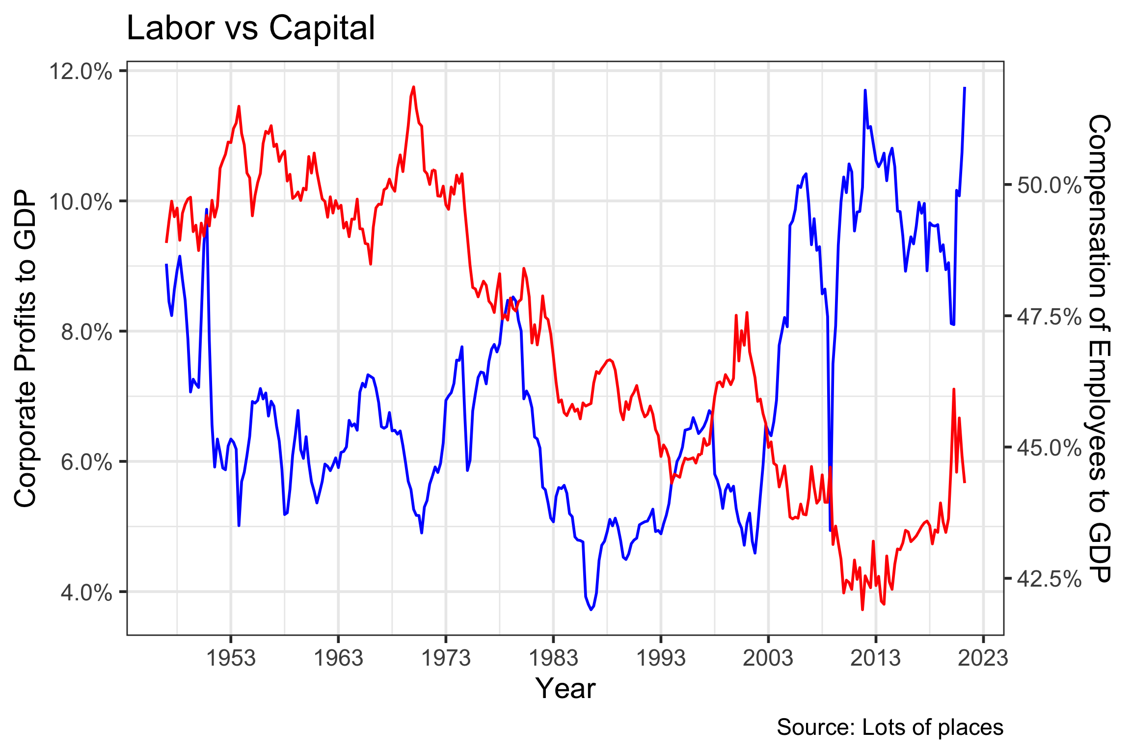 The rise in monopoly power particularly in big technology, but possibly, more broadly across the economy and stock market has been a growing topic of conversation in recent years. America’s Monopoly Problem Goes Way Beyond the Tech Giants by David Doyen, and Monopolies Are Distorting the Stock Market, by Kai Wu of Sparkline Capital, one of our favorite data-driven bloggers, are good examples of this thinking. In addition to data on industry concentration, Wu draws the link to discussions over stagnating real wages, and sustained higher profit margins of companies since 1980 in the chart above, which we have seen referenced frequently in the last few years.