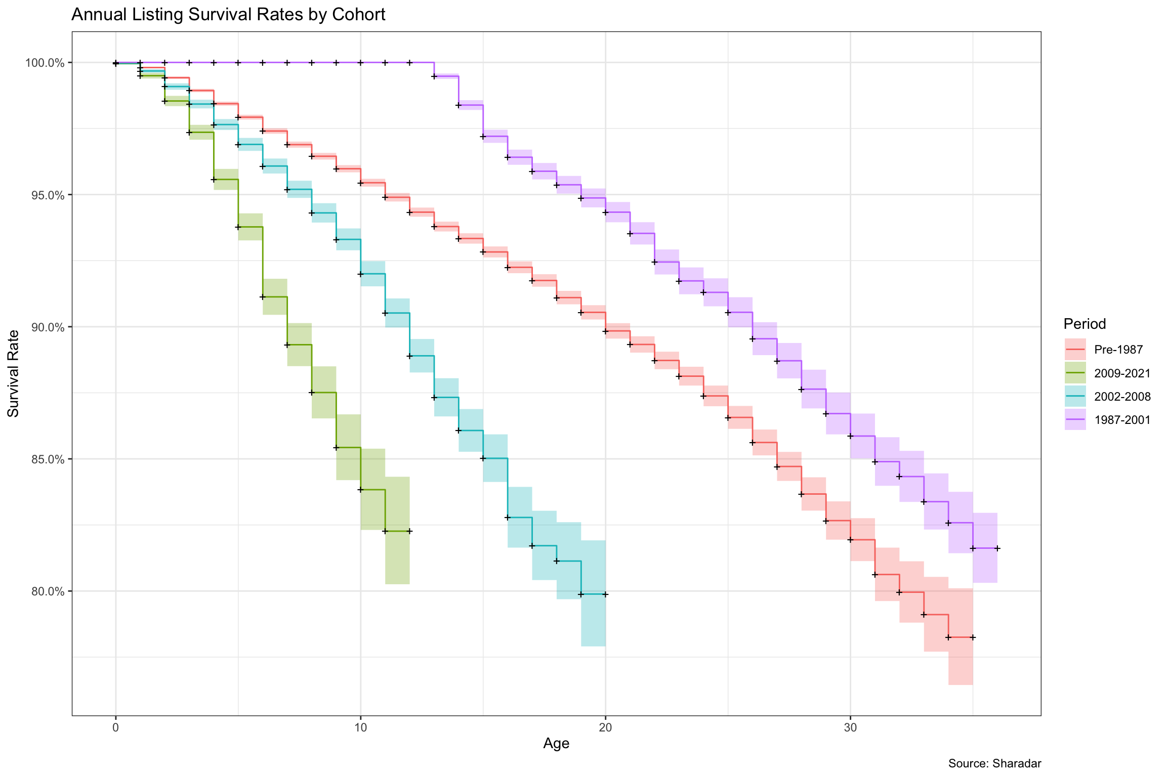 The different story starts with companies born in the 2002-2008 cohort, when the survival rate decline is much more rapid. We can see that the years of age are shorter, because every company in the period is measured from its first trading year, and confidence bands are wider, because there are fewer companies included in those cohorts. When the more recent bull market began in the 2009 cohort (green), the survival rate is even lower (even though we have actually removed the most recent surge in SPAC issuance). It also seems that the rate of de-listing for the earlier groups also accelerates around the same time as the later cohorts start. Looking at the x-axis from right to left allows to see comparable periods, and interestingly, the most recent cohort appears like it will soon catch up to the others, even though it started 12 years after then next latest. All in all, about 20% of companies for all of the cohorts have been de-listed.